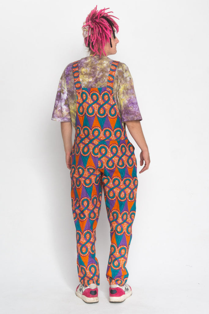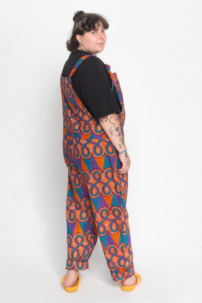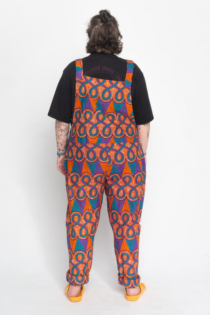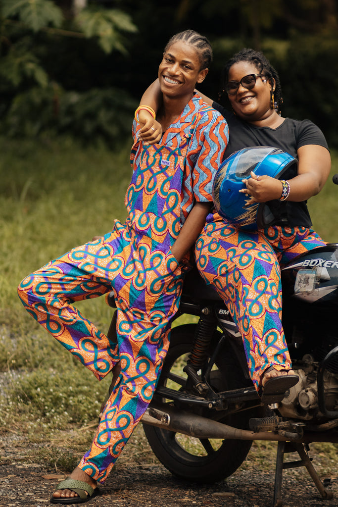 Głębokie boczne kieszenie na biodrach pomieszczą dużego powerbanka i nic z nich nie wypada. Paski przy górnej części pomagają wyregulować idealną wysokość krocza i przedłużyć wzrost względem tabeli wymiarów do 15 cm. Ogrodniczki uszyli krawcowie w szwalni New Havenn w Akrze w Ghanie.