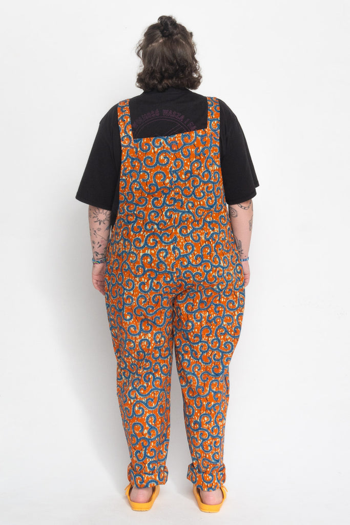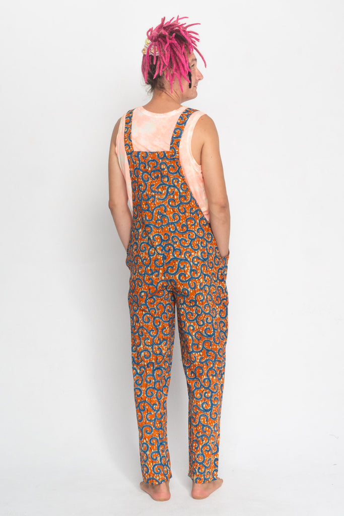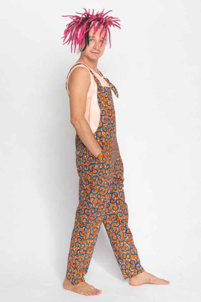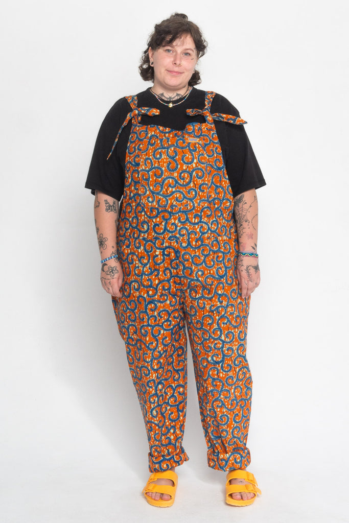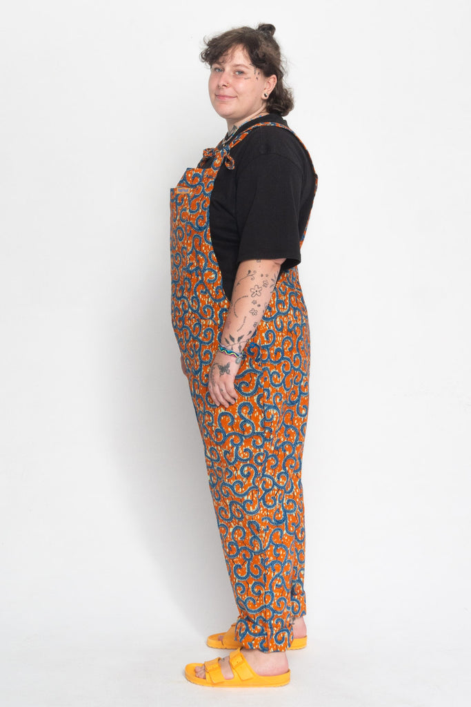 Głębokie boczne kieszenie na biodrach pomieszczą dużego powerbanka i nic z nich nie wypada. Paski przy górnej części pomagają wyregulować idealną wysokość krocza i przedłużyć wzrost względem tabeli wymiarów do 15 cm. Ogrodniczki uszyli krawcowie w szwalni New Havenn w Akrze w Ghanie.