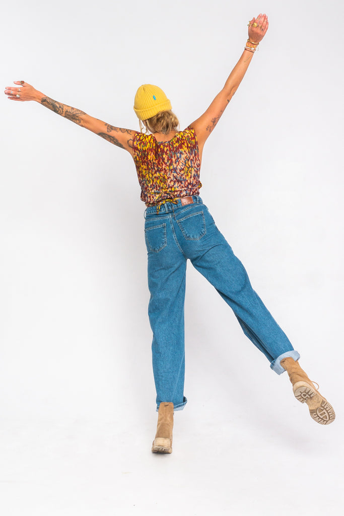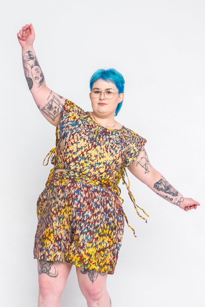 Topy wiązane uszyli krawcowie i krawcowe ze szwalni New Havenn w Akrze w Ghanie. Bawełniana tkanina, której użyliśmy do produkcji, jest delikatniejsza, niż ta, którą znacie z Tanzanii. Ręcznie barwili ją Esther i jej pomocnicy w Ghanie, dlatego ułożenie wzoru i odcień koloru mogą się subtelnie różnić względem zdjęć. Taki urok barwienia metodą batiku, że nigdy nie otrzyma się idealnie tej samej barwy, co czyni każdą sztukę unikalną.