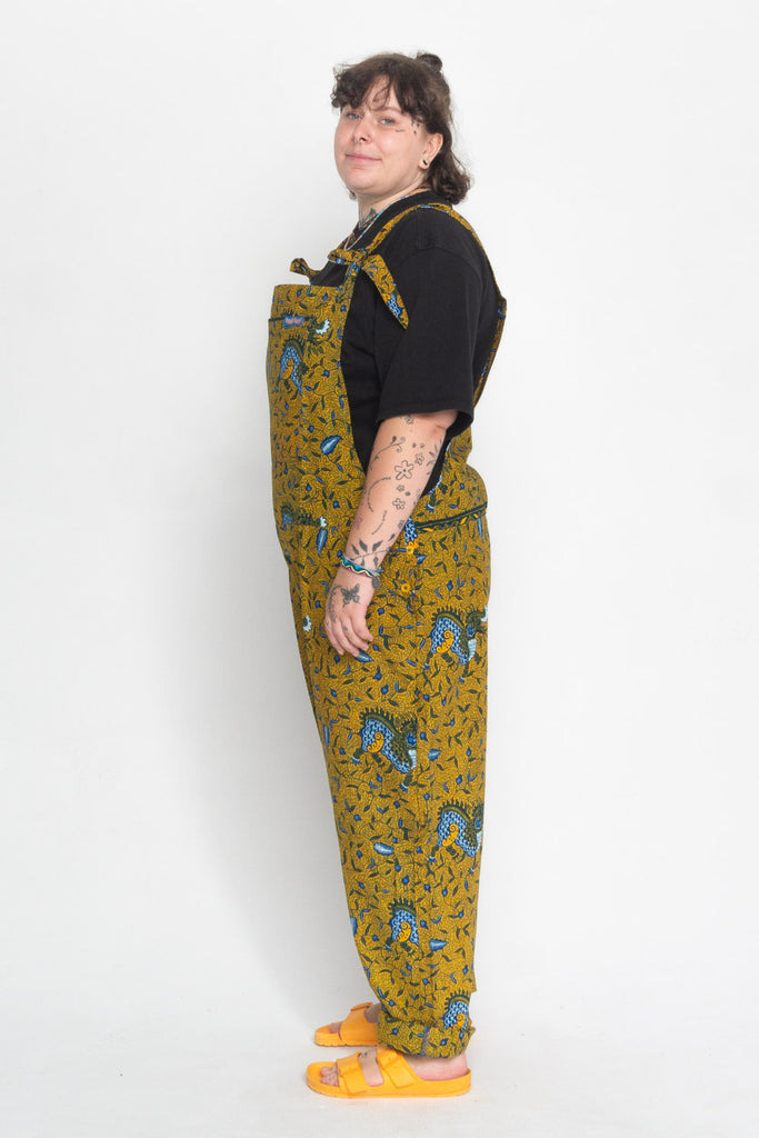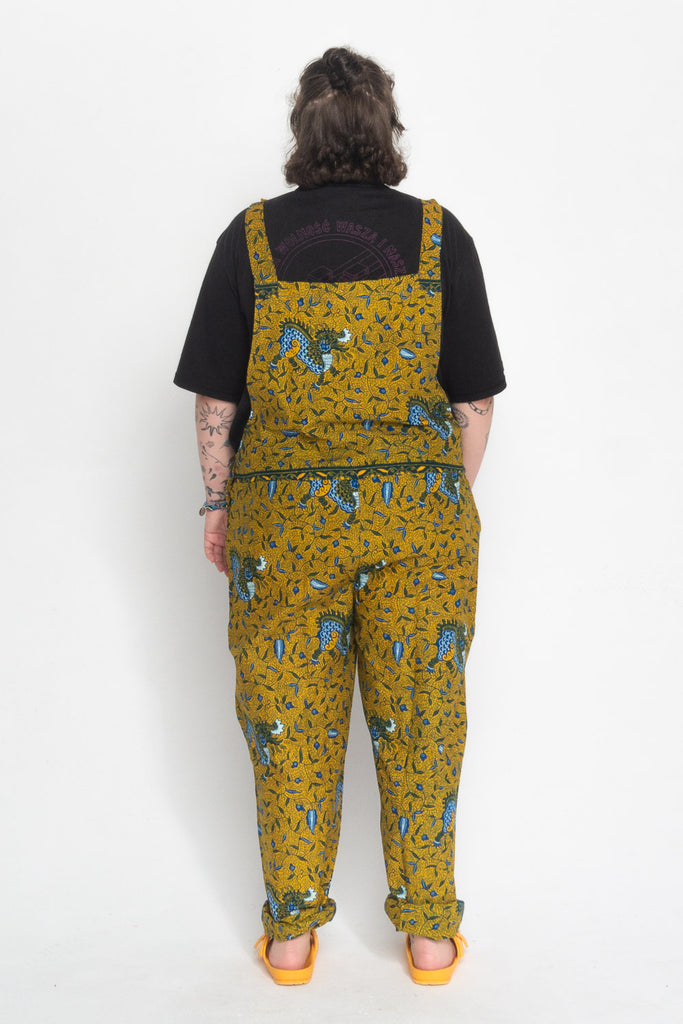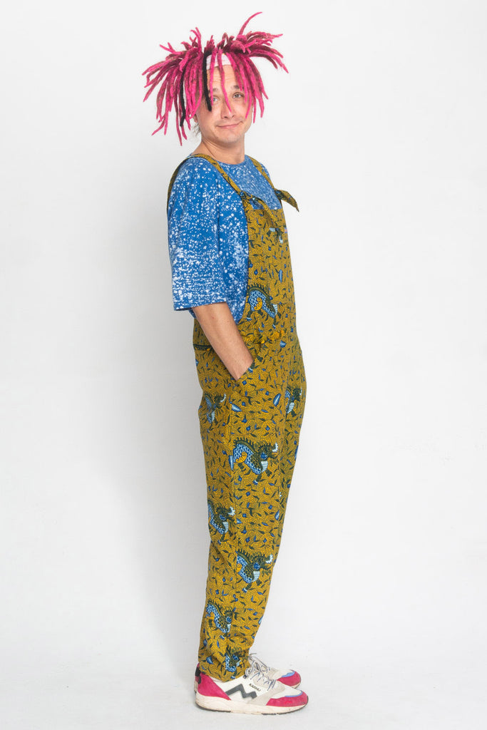 Głębokie boczne kieszenie na biodrach pomieszczą dużego powerbanka i nic z nich nie wypada. Paski przy górnej części pomagają wyregulować idealną wysokość krocza i przedłużyć wzrost względem tabeli wymiarów do 15 cm. Ogrodniczki uszyli krawcowie w szwalni New Havenn w Akrze w Ghanie.