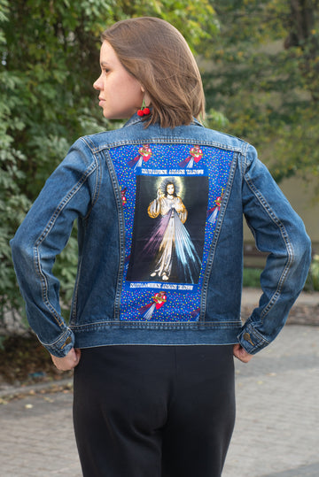Odnowiona kurtka jeansowa marki Lee. Doszyłem do niej 3 kawałki tkaniny, którą kupiłem 5 lat temu pod katedrą w miejscowości Musoma w Tanzanii. Niestety, mieli tylko mały kawałek tkaniny. Kurtka jest unikalna i nikt na świecie nie ma drugiej takiej!