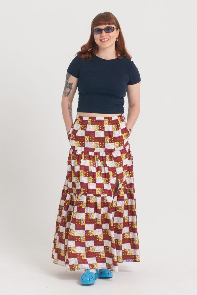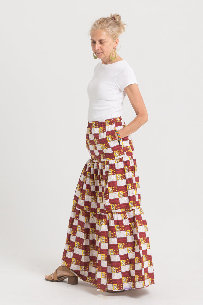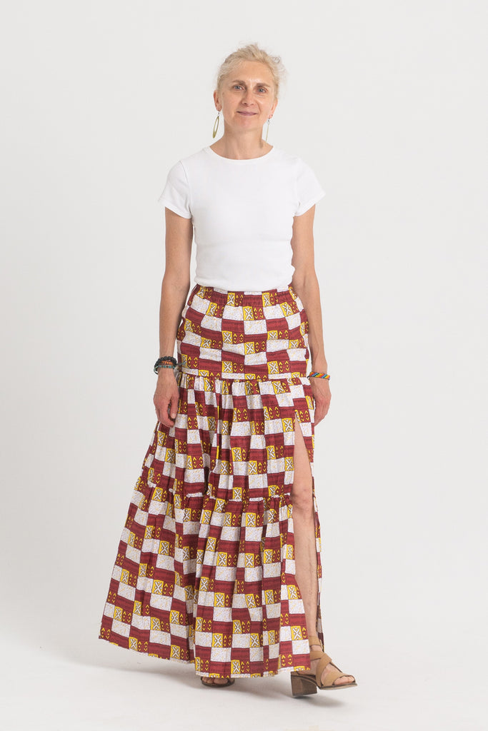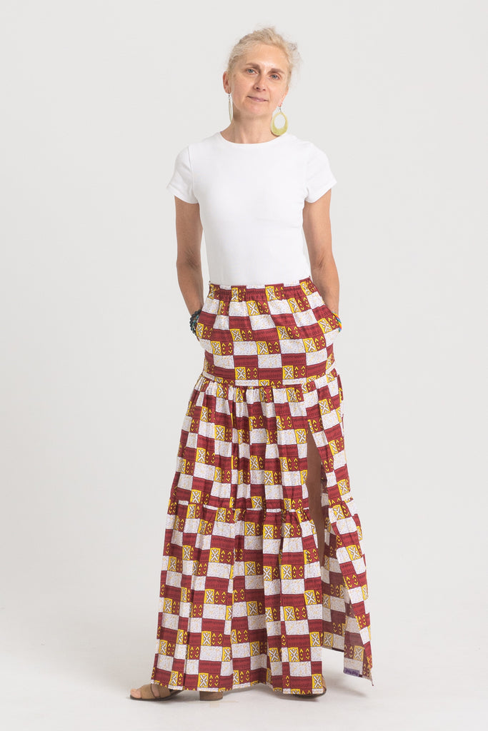 Przewiewna spódnica maxi składa się z trzech paneli, które dają pełną swobodę ruchu. Ma elastyczną talię, duże, praktyczne kieszenie i efektowne rozcięcie z boku sięgające do uda – dla luzu i wygody. Uwaga – ona ma kieszenie!