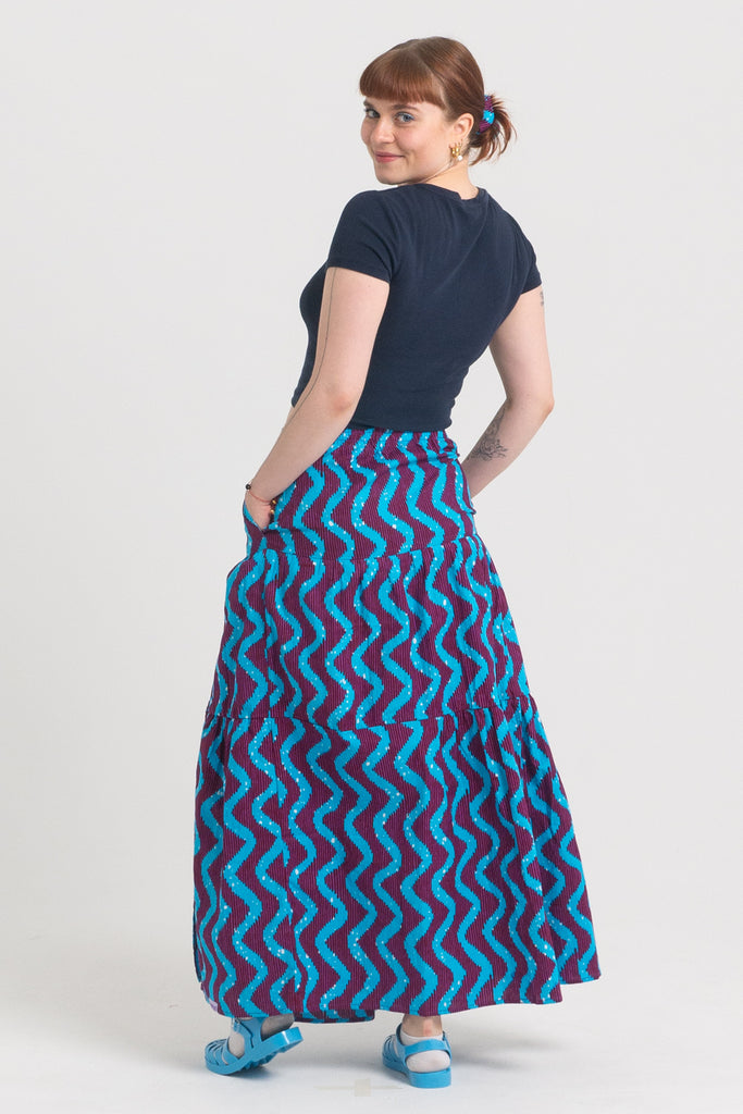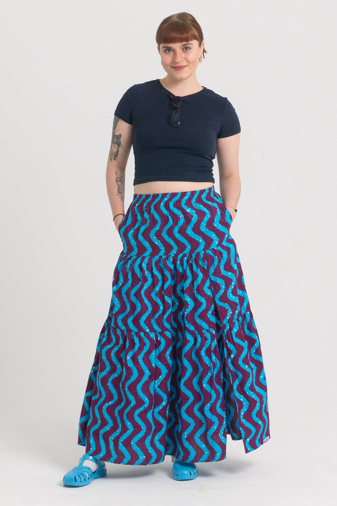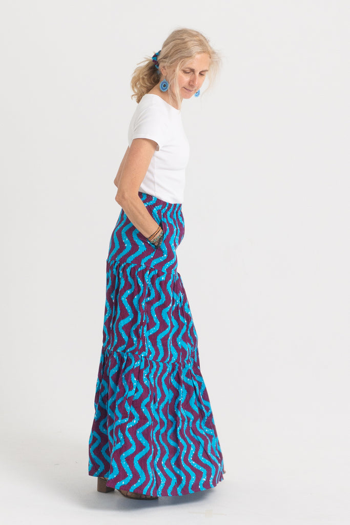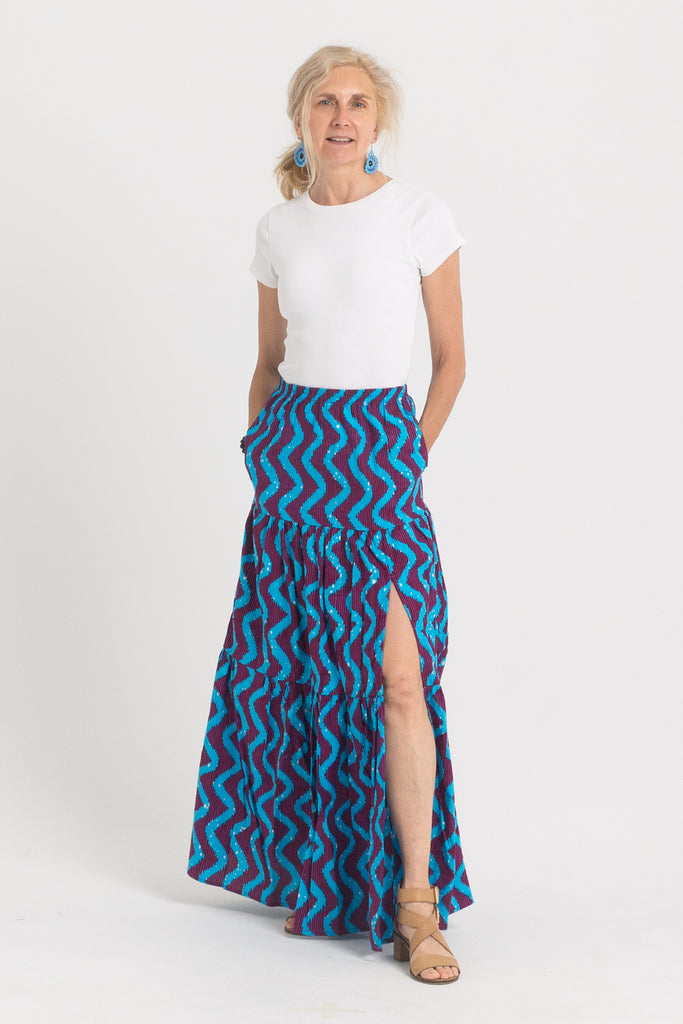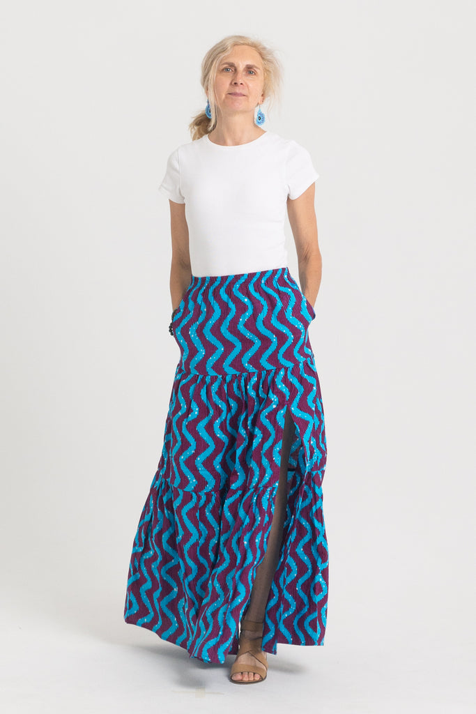 Przewiewna spódnica maxi składa się z trzech paneli, które dają pełną swobodę ruchu. Ma elastyczną talię, duże, praktyczne kieszenie i efektowne rozcięcie z boku sięgające do uda – dla luzu i wygody. Uwaga – ona ma kieszenie!