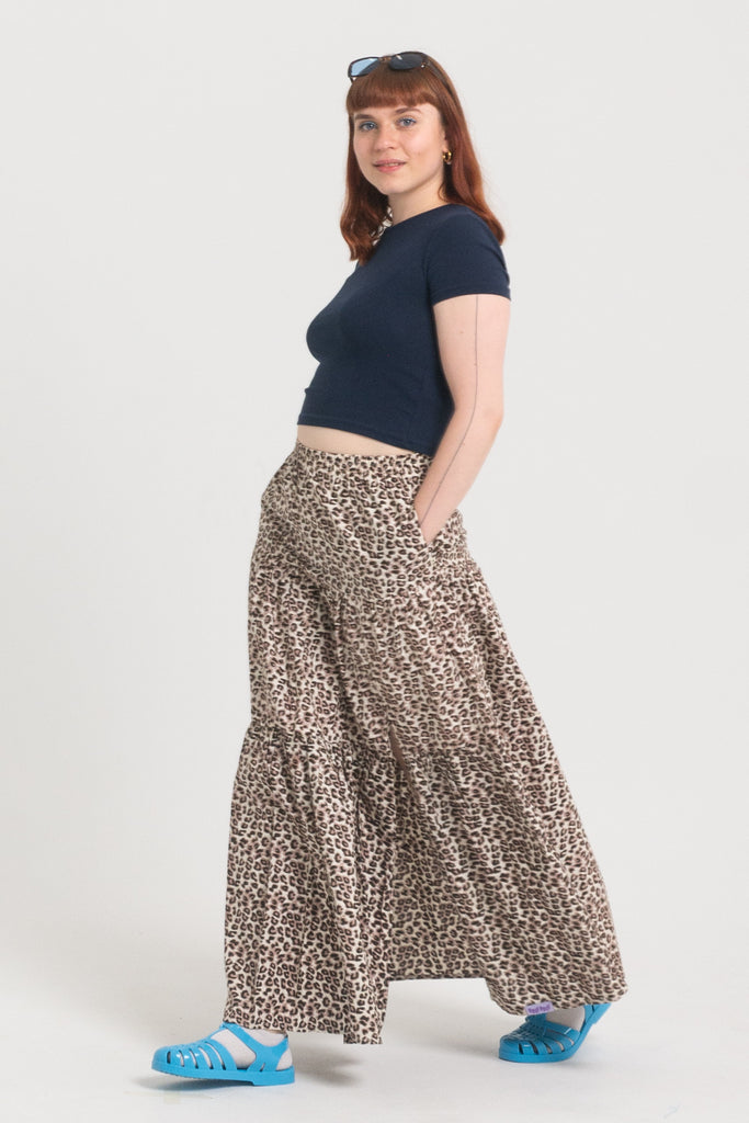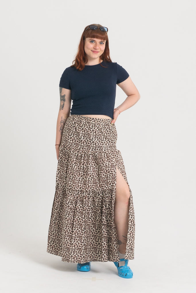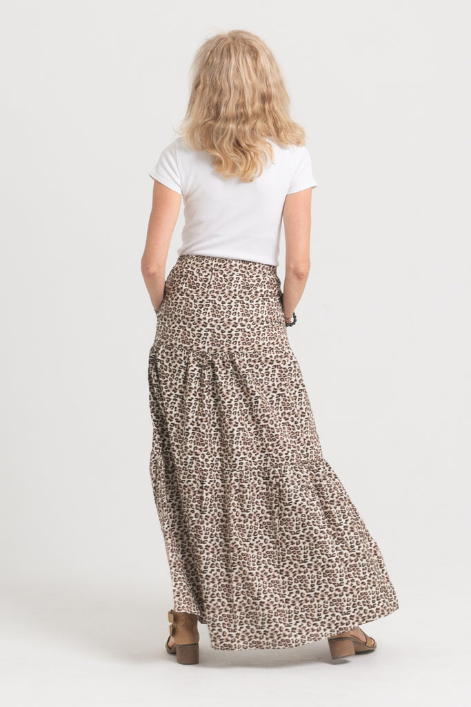 Przewiewna spódnica maxi składa się z trzech paneli, które dają pełną swobodę ruchu. Ma elastyczną talię, duże, praktyczne kieszenie i efektowne rozcięcie z boku sięgające do uda – dla luzu i wygody. Uwaga – ona ma kieszenie!